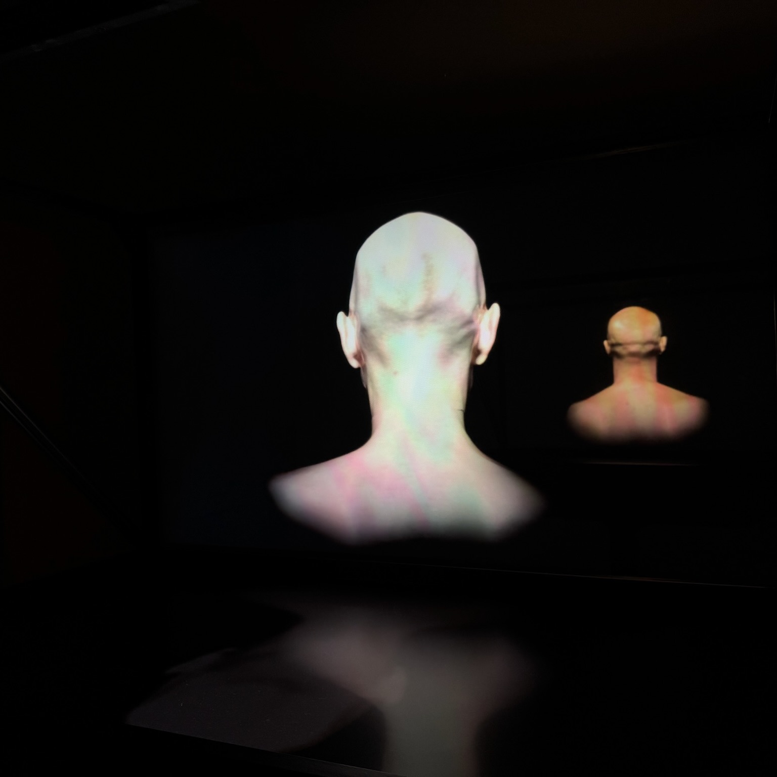 Six identical metal stands, each a simple black structure supporting a glass orb that shimmers like an opal of light. Within each vitrine, suspended like the swirl in a glass marble, you could see a swell of water pulses at eye level. Screened on the far wall, a river moved to a matching rhythm, the eye held inches above the water as the far bank slipped in a low rumble to the left. A series of landscape photographs was displayed before the holographic vitrines displaying people, which you observe from man's most vulnerable area, their backs.