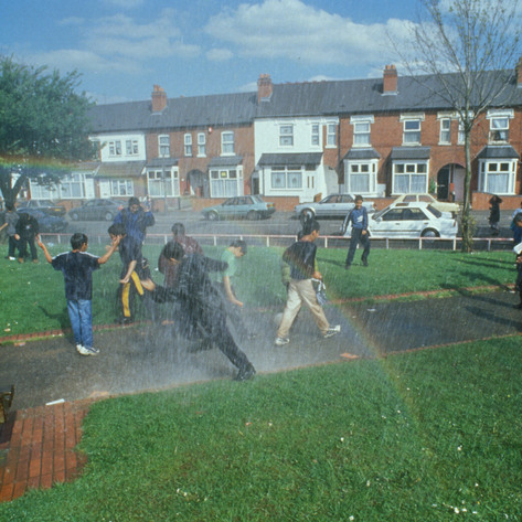 Cotterrell‘s contribution to this Environmental Art Community Consultation was a work of mystery: an inexplicable ‘geyser’ in the middle of a Birmingham suburb, which from May to August daily shot 500 litres of water in a column 30 metres high. Saltley has a long history of immigrant populations: Victorian industry attracted Irish and European workers from a variety of faiths and today many residents are from Southern Asia. A large proportion of the area is fluent in Urdu or Bengali but many speak little or no English. Cotterrell was interested in creating a piece of public work capable of transcending language barriers. Like the party atmosphere of a Brooklyn summer, when fire hydrants are tampered with to allow water play, Cotterrell’s geyser served as a meeting point for the local community of Couchman Road Park. A hole measuring 10 metres in depth and 30 cm in diameter was bored by Roger Bullivant Ltd using hydraulic pile-driving machinery. The hole was reinforced with steel sheets and a pump was suspended close to its bottom. Midlands Electricity Board supplied a 3-phase electricity inverter to power the pump. Piping was attached to the pump and fed up to a nozzle concealed just below ground level. Cotterrell dug a 20metre trench from the road into the park, into which a pipe, supplied by Severn Trent Water, was fed to supply the geyser’s requisite 500 litres of water a day. At 4pm, The Saltley Geyser would promptly erupt. Local residents gathered in the park to witness the event. Within days of its installation, news of the ‘phenomenon’ had spread, and people were making an effort to meet at the geyser in order to chat, catch up on gossip and watch their children play in the water. This public green space was in a state of decline: many residents avoided the park as there seemed to be constant supply of burnt out cars decorating its landscape. But the same people responsible for various acts of vandalism took ownership of Cotterrell’s geyser; keeping the site secure became de rigueur for local teenagers in the months their geyser was operational.
