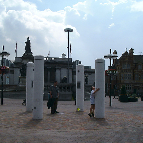 Collaborative work by David Cotterrell and Alberto Duman Voice Over was commissioned by Hull Time Based Arts as the organisation’s PEACE (Public Electronic Art Commission Exposition) Project and was launched on July, 29th 2000. Within a 9m2 site of public land in the area adjacent to the new HTBA site, the installation was designed to create a sonic environment in which all incoming sound is digitally altered. The processed ambient sound is then relayed back to the transient audience, subtly shifting perceptions of scale and space. Within the confines of this virtual enclosure - delineated by only four posts - the public are invited to experience themselves in the midst of the city’s bustling centre while invisibly fenced off from the outside world’s sonic resonance. ‘Voice Over’ is a chance to rediscover one’s own public surroundings though a shifting audio landscape, a vacuum which anyone can populate with their own notions of peace.